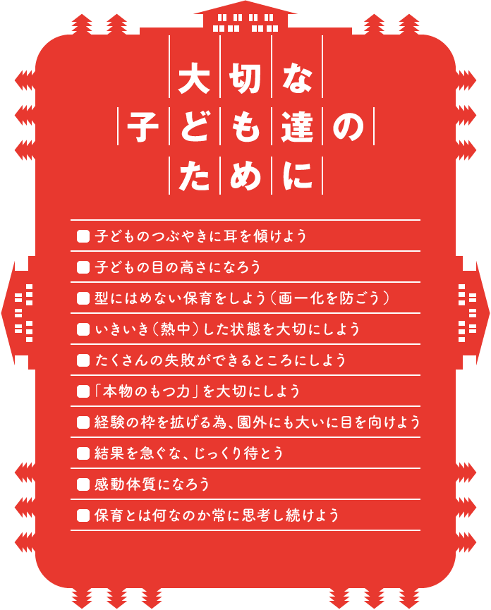 子どもたちは、自ら心を動かし、自由に遊びながら、様々な体験を重ねることにより、必要な発達をしていきます。保育者は、そんな子どもを信頼して、育ちを援助します。